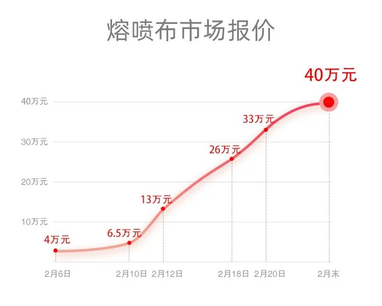 作為醫(yī)用口罩中過(guò)濾病菌的重要原材料,新冠疫情的爆發(fā),讓熔噴布成為了比口罩更緊缺的“備戰(zhàn)物資”。市場(chǎng)售價(jià)從最初的1.8萬(wàn)元/噸,攀升到最近的40萬(wàn)元/噸。